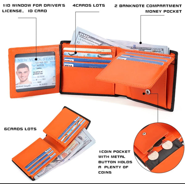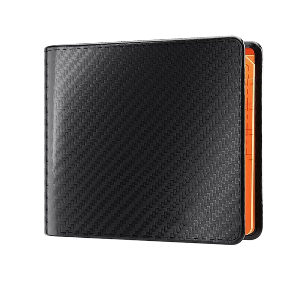 Chosen specially to go with our watches, this beautiful Carbon Fibre Wallet. Genuine leather with carbon fibre style deign and Orange Detail RFID safe giving good protection for you Contactless...