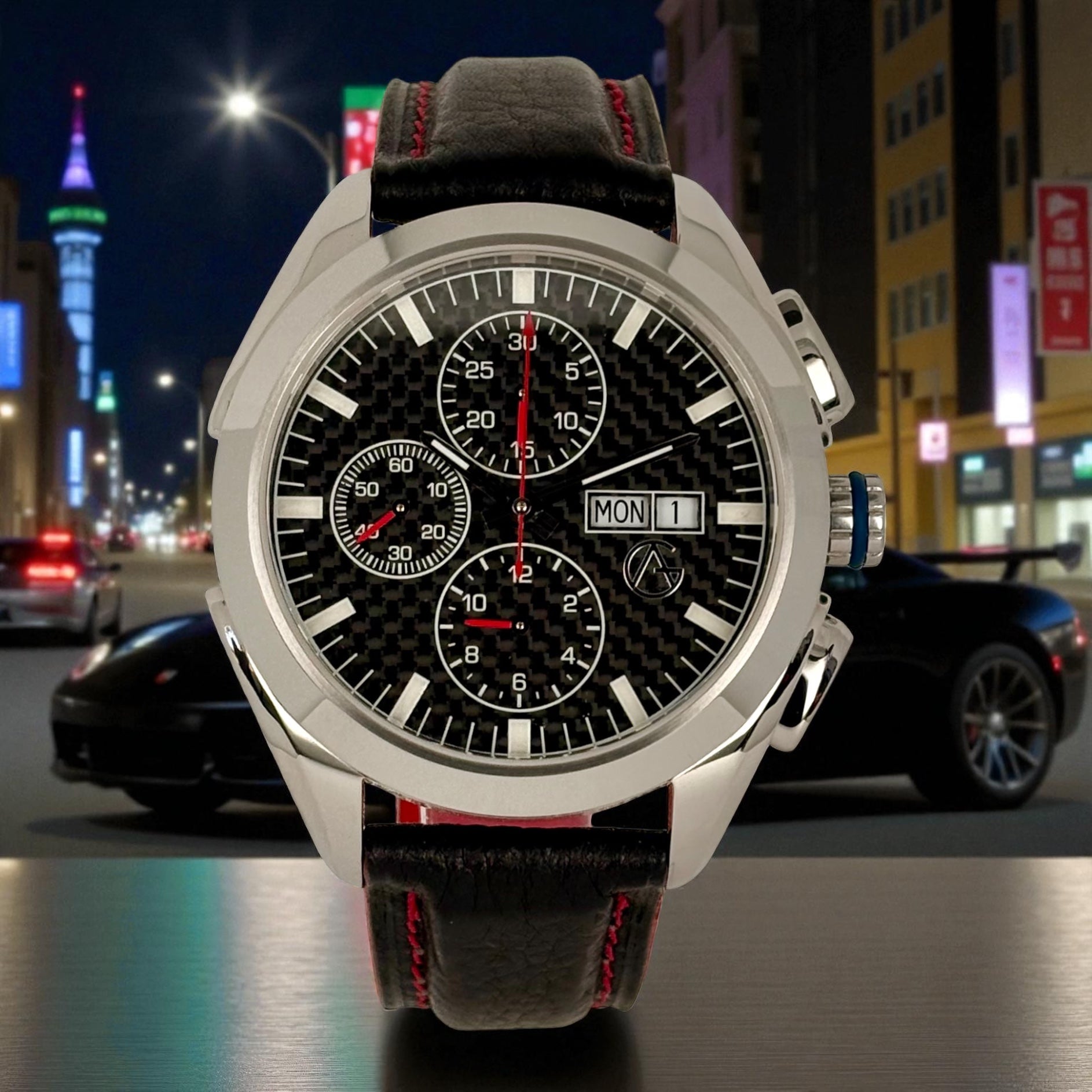 Precision-built chronograph. High-gloss steel case. Deep black carbon fibre dial with motorsport-grade clarity.