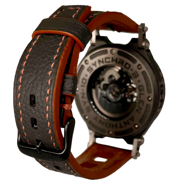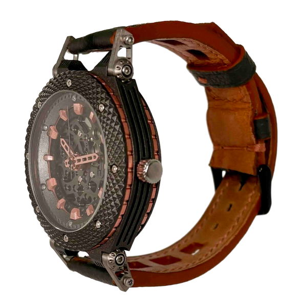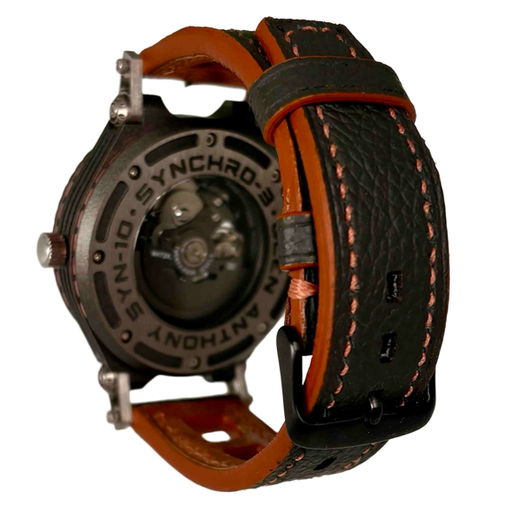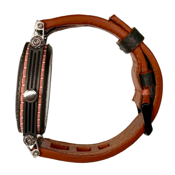 Synchro 3 one of a kind with copper detailing and  knurled bezel 46mm case width 13mm thick chunky but very light Titanium case with our Gun Metal Ceramic coating  Sapphire...